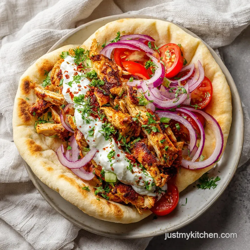 Marinated and seared chicken, tzatziki sauce, pita bread, tomato, red onion, and feta cheese. The contrast between the hot, smoky meat and the cold sauce is crucial.