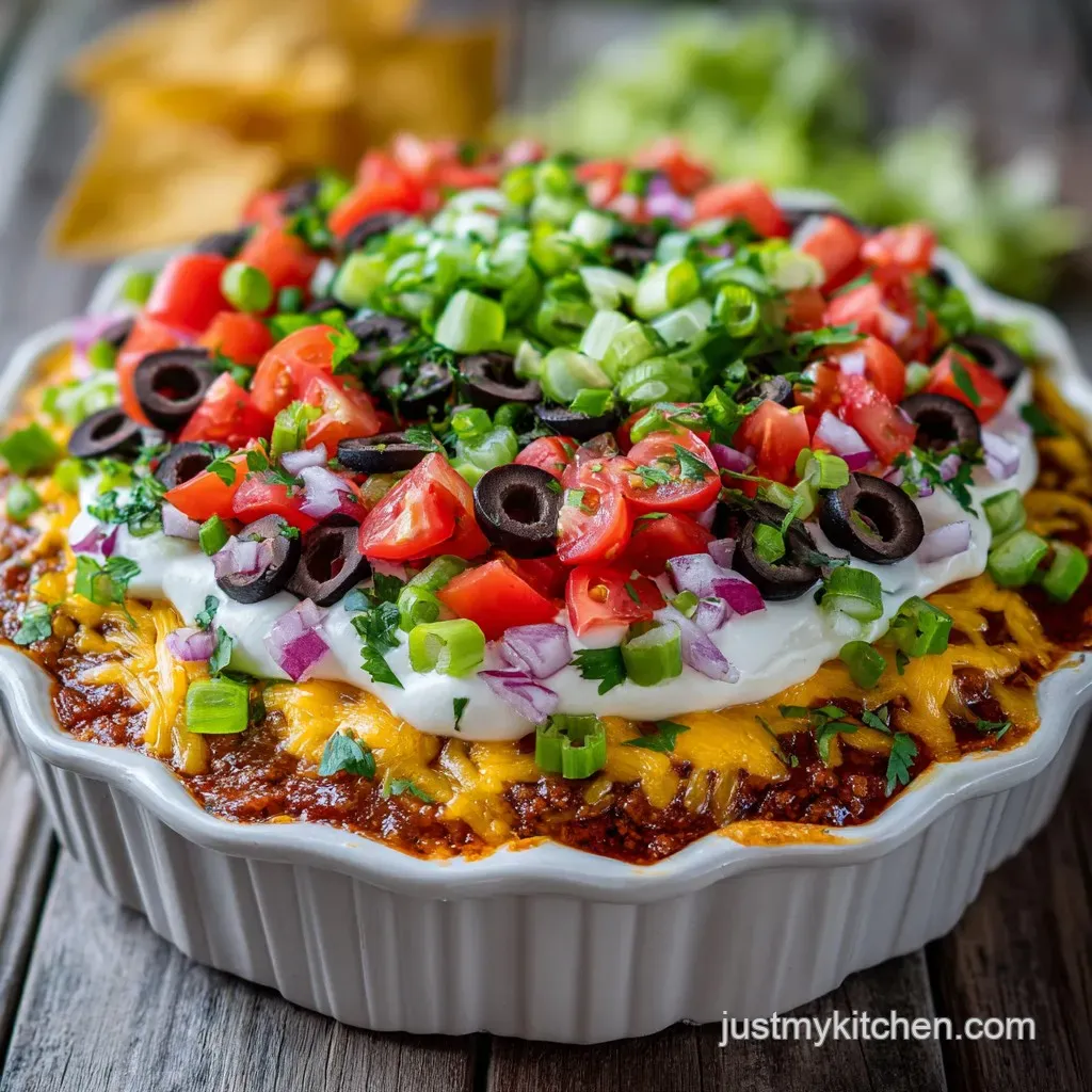 Yes, this is ideal for make-ahead. Assemble all layers except the fresh tomatoes, green onions, and olives up to 24 hours ahead. Add the fresh toppings just 30 minutes before serving to maintain crispness.
